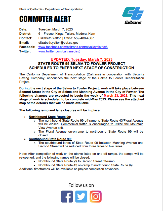 - Affects HWY 99 Northbound travel to SelmaÂ